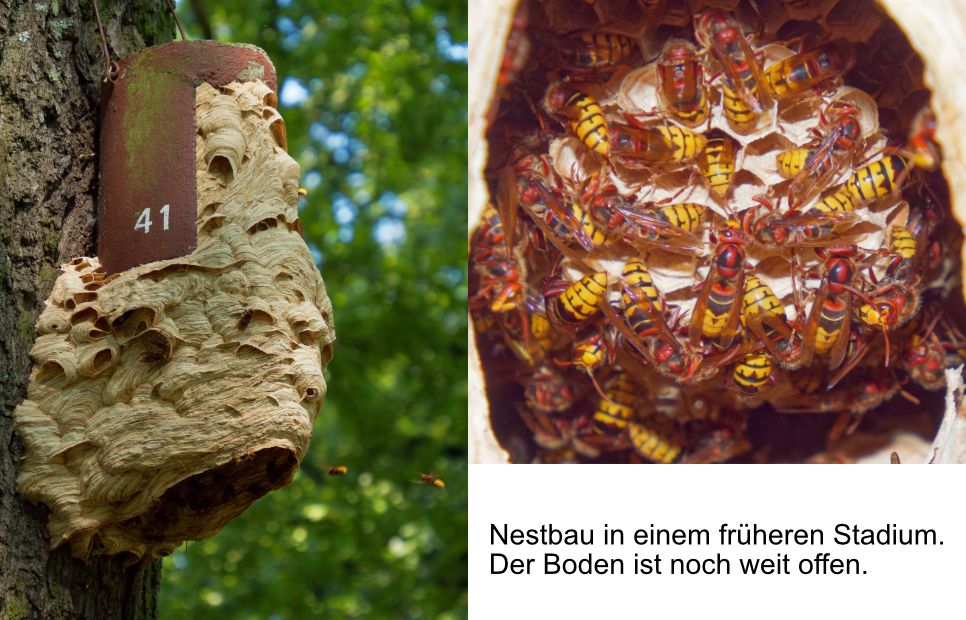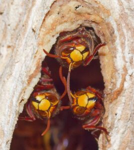 Im Gegensatz zur Europäischen Hornisse verteidigen bei der Asiatischen Hornisse aber nicht nur ein paar Einzeltiere sondern alle flugfähigen weiblichen Tiere das Nest.
