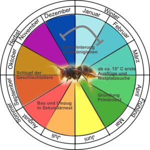 Die Jungköniginnen haben den Winter an einem geschützten Ort verbracht und machen sich etwa ab  April auf die Suche nach einem geeigneten Neststandort. Diese Zeit kann je nach Region ein wenig variieren, Temperaturen um 12 – 15° C sind ihr Startsignal. Der fortschreitende Klimawandel kommt ihnen dabei entgegen.