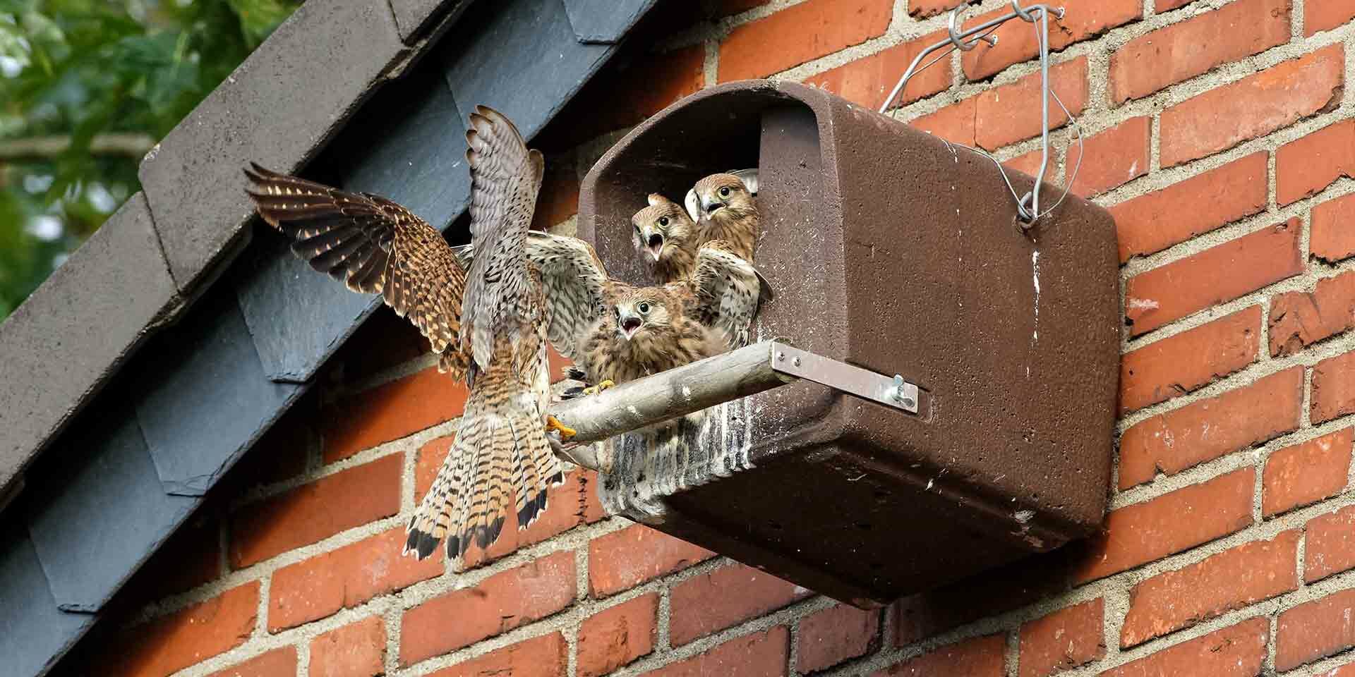 Vor 4 Jahren hat die NABU-Naturschutzstation Leverkusen-Köln zusammen mit der Leverkusener Feuerwehr einen Turmfalkenkasten am Feuerwehrturm in Bergisch Neukirchen aufgehängt. Und seit diesem Jahr ist er erfreulicherweise auch bewohnt – Anfang Juli flogen 4 quietschlebendige junge Turmfalken aus. „Es ist erfreulich zu sehen, dass sich Zusammenarbeit für die Natur immer wieder lohnt. So konnten wir hier in Bergisch Neukirchen wieder einen Brutplatz für den inzwischen bei uns seltener gewordenen Turmfalken etablieren“ sagte unser Turmfalkenspezialist Hans-Martin Kochanek.