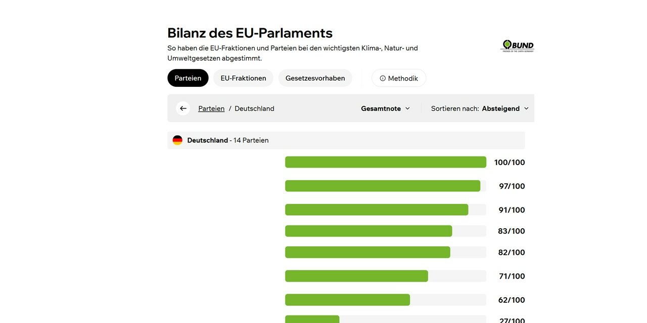 Unter dem Link https://www.bund.net/europawahl/bilanz-legislatur (*) finden Sie eine Bilanz (Analyse von 30 Gesetzesvorhaben), wie die EU-Fraktionen und Parteien des EU-Parlaments in der vergangenen Legislaturperiode bei wichtigen Klima-, Natur- und Umweltgesetzen abgestimmt haben.