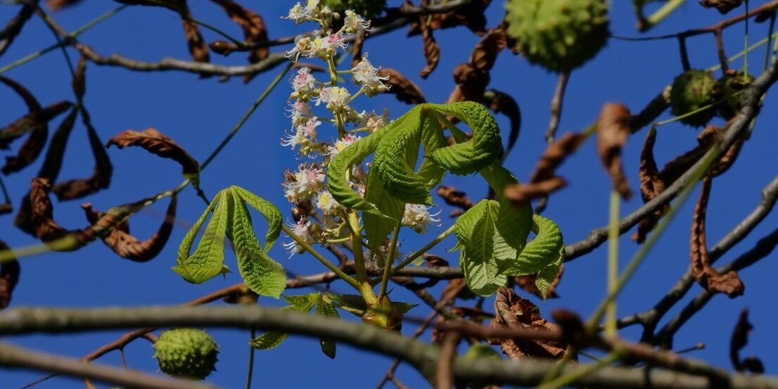 Kein unbekanntes Phänomen, wie die Fachleute versichern. An einigen Stellen in der Stadt treiben komplett entlaubte Rosskastanien an den Spitzen ihrer Äste neue Blätter aus und beginnen zu blühen. Sie waren zuvor von der alljährlichen Rosskastanien-Miniermotte kahlgefressen worden. Zusammen mit der Trockenheit diesen Sommer ein Stress für die Bäume. Das neue Austreiben und Blühen im Herbst wird daher oftmals als „Notblüte“ oder „Angstblüte“ bezeichnet. Die Begriffe stammen von der Annahme, dass die Bäume den erlittenen Schaden zu kompensieren versuchen, indem sie noch einmal Früchte mit Samen bilden, bevor sie wegen ihrer Schäden womöglich sterben. Allerdings ist diese Theorie aus Sicht der Wissenschaft wenig haltbar.