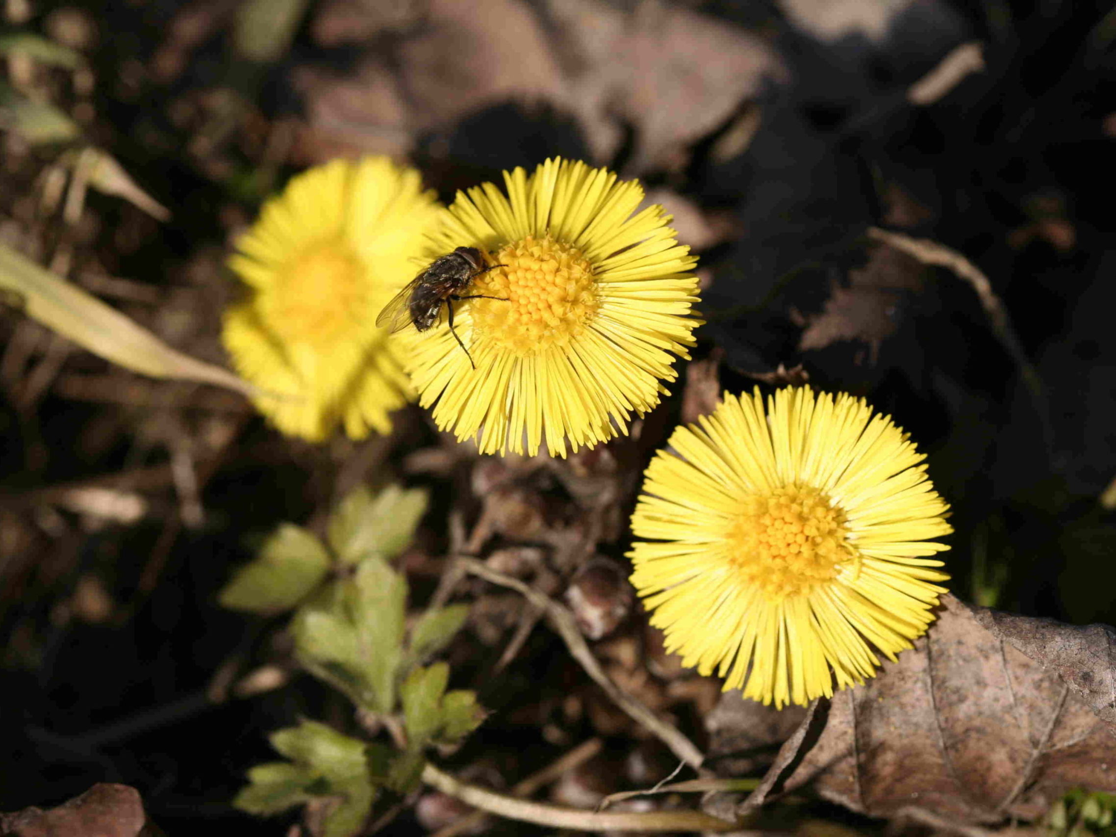 Von ungefähr Anfang März bis Mitte April, je nach Witterungsbedingung, reckt der Huflattich seine gelben Blütenköpfe in die Frühlingssonne. Er gehört zur Familie der Korbblütler und sieht auf den ersten Blick aus wie ein kleinerer, blattloser Löwenzahn. Die mehrjährige Pflanze bildet unterirdisch teilweise bis zu zwei Meter lange Ausläufer und kommt häufig an Weg- und Feldrändern, Bahndämmen, Brachland und weitere trocken warmen Standorten vor. Bienen, Käfer und Insekten erfreuen sich an den nektarreichen Blüten, welche ein wenig nach Honig duften. Der Huflattich hat eine lange Geschichte und galt in der Antike schon als bekannte Heilpflanze. So taucht die Pflanze unteranderem schon in den Kräuterbeschreibungen von Plinius, Hildegard von Bingen und Lonitzer auf. Ihre Art gilt seither als wichtige Heilpflanze und wird bei Entzündungen, sowie bei Husten und Bronchienleiden verwendet. Nicht umsonst war das Zeichen der Huflattichpflanze früher über der Türe von Apotheken zu finden.