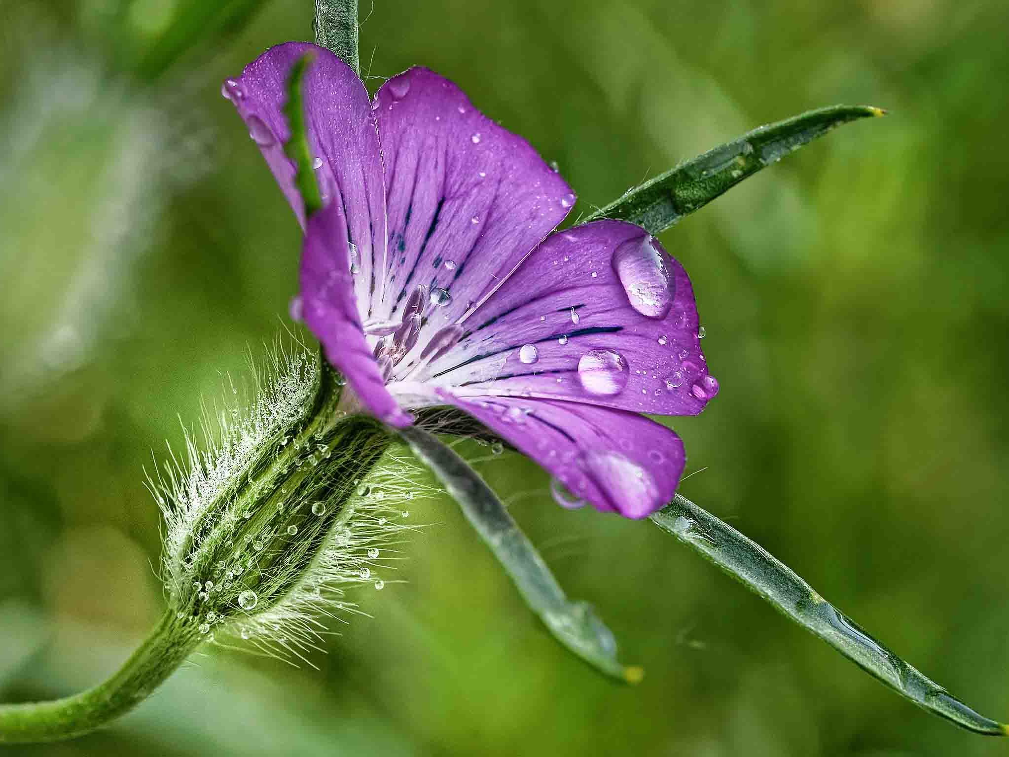 Die purpurrote Blüte der Kornrade ist durch die lang und spitz über die Kronblätter hinausragenden Kelchzipfel wie mit einem grünen Strahlenstern unterlegt. Jedes Kelchblatt zieren punktartig gezeichnete, auswärts ziehende Linien, die zusammen mit dem weißen Fäden der Staubblätter die bis zu 2cm große Blüte noch prächtiger erscheinen lassen. Die einjährige Pflanze, die von einen zottigen Härchenpelz überzogen ist, hat schmale, ganzrandige Blätter und kann eine Höhe von 50 bis 100cm erreichen. Sie ist lichtliebend und bevorzugt nähstoffreiche und regelmäßig (im Herbst) bearbeitete Standorte.